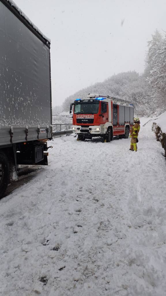 Mittels Pager und SMS wurden die Einsatzkräfte der FF-Lend um 10:47 Uhr von der LAWZ Salzburg zu einer LKW Bergung auf die Gasteinerstraße L270A alarmiert. Unverzüglich rückte die Einsatzmannschaft mit dem Rüstlöschfahrzeug an die oben genannte Örtlichkeit aus. Vor Ort wurde ein Sattelzug ohne Schneeketten trotz der tiefwinterlichen Fahrverhältnisse vorgefunden. Nach dem Anlegen der Schneeketten wurde das beladene Schwerfahrzeug mithilfe der Seilwinde im Beisein eines privaten Abschleppunternehmens aus der misslichen Lage befreit. Nach rund 2 Stunden konnte der Einsatz beendet und die Einsatzbereitschaft im Feuerwehrhaus wieder hergestellt werden.